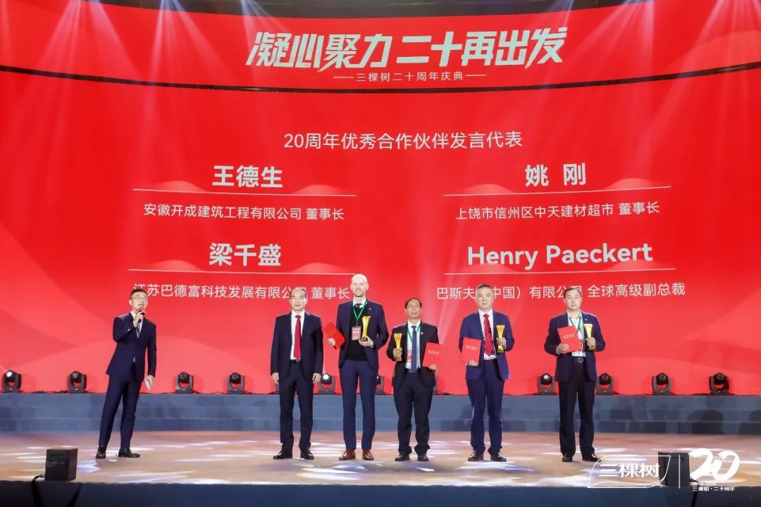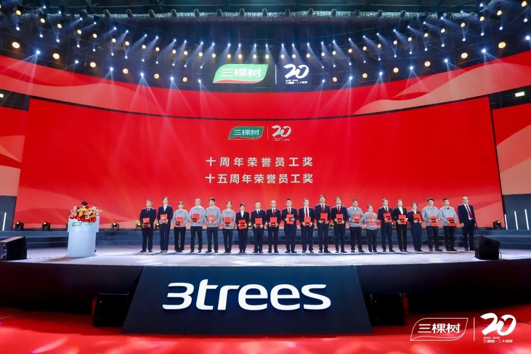 在表彰環(huán)節(jié),60名合作伙伴獲得三棵樹“20周年優(yōu)秀合作伙伴”榮譽(yù);20名三棵樹奮斗者獲頒“20周年貢獻(xiàn)獎(jiǎng)”,另有20名陪伴三棵樹20年一起成長的奮斗者獲頒“20周年榮譽(yù)員工獎(jiǎng)”。多名合作伙伴代表上臺(tái)領(lǐng)獎(jiǎng)并發(fā)表感言,2名員工代表做了深情分享。投融資機(jī)構(gòu)代表發(fā)表致辭,高度評(píng)價(jià)了三棵樹在資本市場的良好表現(xiàn)。