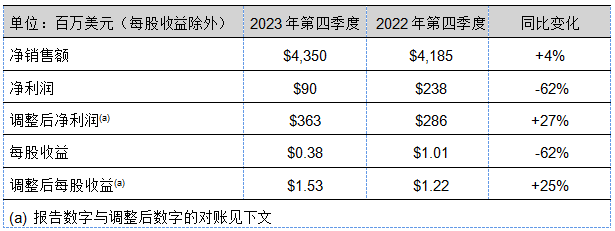 2023年度實現了創紀錄的凈銷售額,約為182億美元,較上年增長3%左右。在銷售價格上漲的帶動下,有機銷售額增長了3%。調整后每股收益也創下歷史新高,增長了27%,原因包括銷售價格上漲、投入成本下調、結構性成本節省和有利的外幣折算,但被銷量下降部分抵消。年末,投入成本和庫存水平仍高于歷史水平。