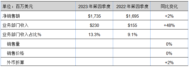 工業領域涂料業務部門的凈銷售額高于2022年第四季度,主要是因為有利的外幣折算。
